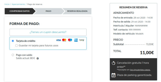 Para poder asegurar tu plaza de aparcamiento, el pago de la reserva es inmediato. Podrás seleccionar pago con tarjeta de crédito/débito (Euro 6000, Mastercard o Visa) o con tu saldo Parking Llucmajor.
